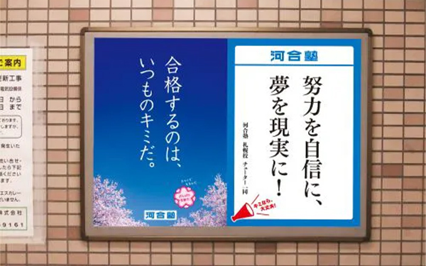 河合塾グループは、2025年2月25日(火)からの国公立大学前期試験に挑む受験生を応援する交通広告を、全国6都市の駅や電車内に掲出しました。