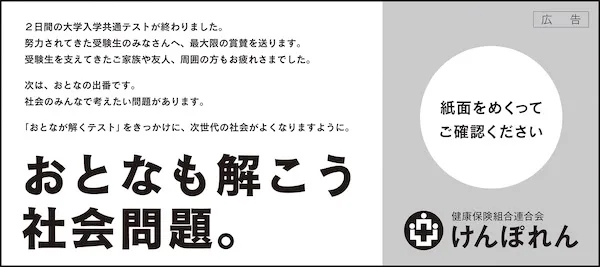 18. 次は「おとなが解く」問題を。共通テストの問題・解答掲載日に合わせた健保連の新聞広告
