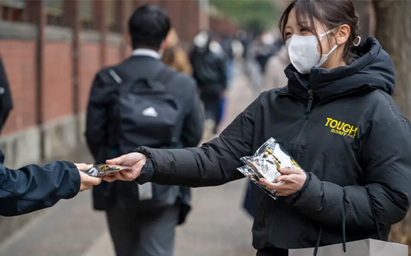 カバヤ食品株式会社は2025年1月18日(土)と1月19日(日)に行われた大学入学共通テストに合わせ、受験生を応援するためのサンプリング企画を実施。本取り組みでは、勉強の合間に集中力をサポートする「タフグミ」と合格祈願を込めた「集中御守ステッカー」をセットで配布しました。