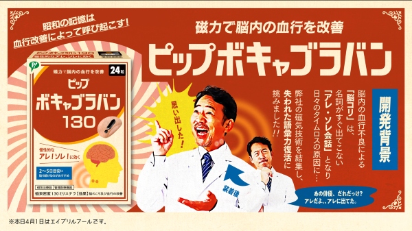 ピップ株式会社は、磁気治療器「ピップエレキバン」シリーズの架空の新商品として、「ピップボキャブラバン」を開発しました。名詞がすぐに出てこない、いわゆる「アレ・ソレ会話」の原因を“脳コリ”と定義し、磁力で脳内の血行を改善するというコンセプトです。