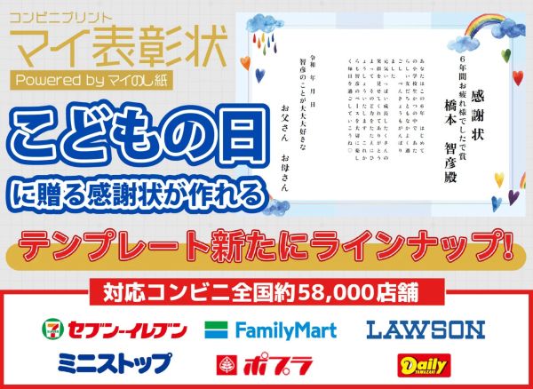 株式会社サムライソードが運営する「マイ表彰状」は、全国約58,000店舗のコンビニエンスストアでオリジナル表彰状をプリントできるサービス。同社は2026年5月の「こどもの日」に向け、既存のカスタマイズ機能に加えて「定型文テンプレート」を新規実装しています。