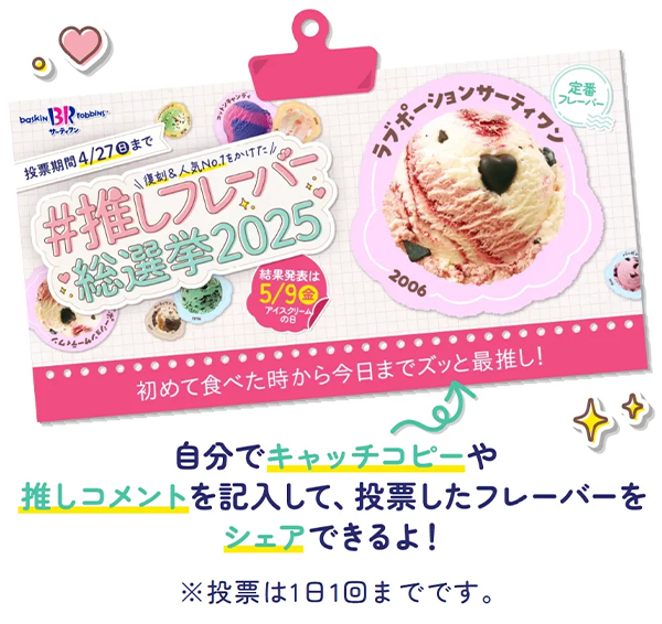 B‐R サーティワン アイスクリーム株式会社は、2025年3月31日(月)から4月27日(日)まで、「サーティワン #推しフレーバー総選挙2025」を開催しました。