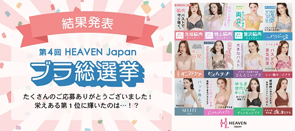 下着の開発・販売を行う株式会社HEAVEN Japanは、公式Xや自社サイトでWEB投票企画「第4回 HEAVEN Japan ブラ総選挙」を2025年5月16日(金)から5月21日(水)までの期間で実施し、投票結果を発表しました。12タイプの立候補ブラから栄えある1位に輝いたブランドは、2025年度 HEAVEN Japan秋冬カタログの表紙を飾ります。