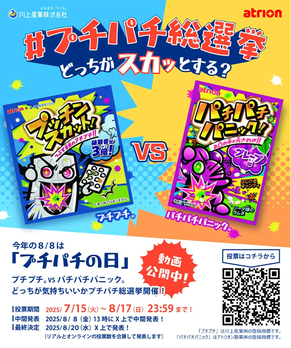 2025年8月8日(金)アトリオン製菓と川上産業が「プチパチの日」と題した共同プロモーションを展開。「パチパチパニックの日」と「プチプチの日」が重なるこの日を記念し、それぞれの人気商品が「どっちが気持ちいい?」をテーマに異業種対決を仕掛けています。