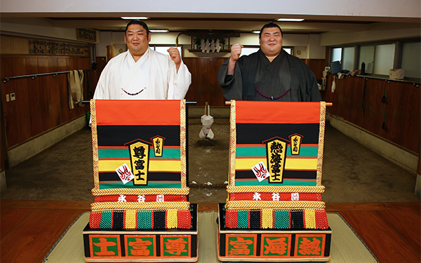 今回贈られたのは「お茶づけ海苔」の商品パッケージをイメージしてデザインされた化粧まわし。同じ部屋の若き力士である2人が共に頑張ることで、大相撲全体が盛り上がればという思いを込めて、ペアの化粧まわしが贈られました。