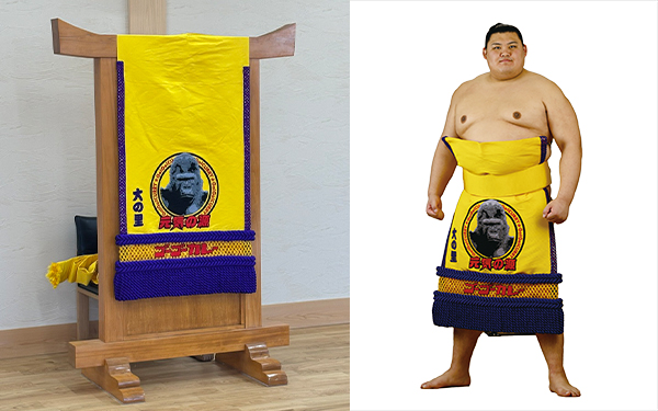 今回贈呈された化粧まわしは、ゴーゴーカレーの象徴である「ゴリラ」を中央にあしらい、ブランドカラーである鮮やかな黄色を基調とした力強いデザインが特徴です。このデザインには、大の里関が「ゴリラ」のように強さと優しさを兼ね備え、相撲界でさらなる活躍を遂げること、そして能登半島に元気と勇気を与え続けてほしいという願いが込められています。
