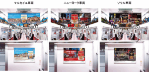 イベント期間は、「鍋THE WORLD de TRIP」の世界観を表現した広告貸切電車が東京メトロ 日比谷線・東西線にて運行されます。マルセイユ、ニューヨーク、ソウルをイメージした装飾で車両内がジャックされ、都市の風景写真だけでなく、フォントやカラーにもこだわったという広告群が、現地の雰囲気を醸し出す異空間へと地下鉄車両を変貌させます。