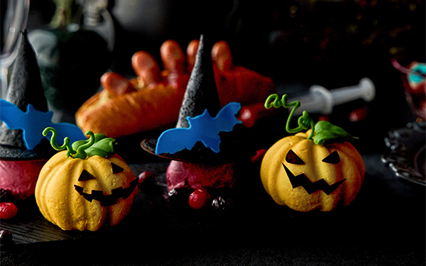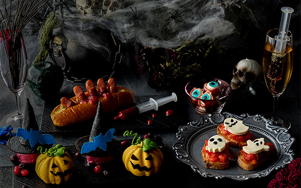 また、当日提供されるフードにもこだわりがあるようです。ソーセージをパーティーへお迎えにきたゴーストの指に見立てたフィンガーホットドッグは、おどろおどろしいリアリティーを追求。ちょっぴり弱気なおばけが集うピリ辛トマトのゴーストブルスケッタ、ハロウィンには欠かせないかぼちゃとフランボワーズの甘酸っぱいスイーツ「ジャック・オ・ランタンムース」などが並びます。
