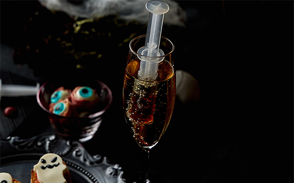 さらにドリンクも充実しています。ハロウィンパーティーの最初の1杯となるのは、昨年も好評だったという注射器でベリーシロップを注入する、不気味なスパークリングワイン。まずは、この1杯でゴーストの色へと染まれます。