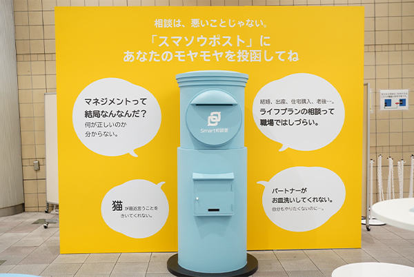 休憩所には、2024年の世界メンタルヘルスデーにイベントを実施した「スマソウポスト」を設置(PR EDGEの記事はこちら)。お風呂で生まれたモヤモヤをはがきに書いて投函することで、気持ちがスッキリととのう体験を提供するものです。