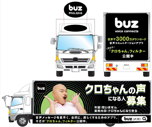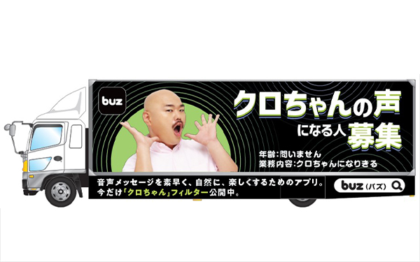 そのリリース告知として、クロちゃん音声フィルターをPRするアドトラックが登場。10月1日(水)から14日(火)までの期間、渋谷・原宿エリアでの走行を予定しています。街中でもひときわ目を引くビジュアルと音声演出で、「buz」の新体験を広く発信するものです。
