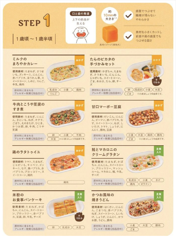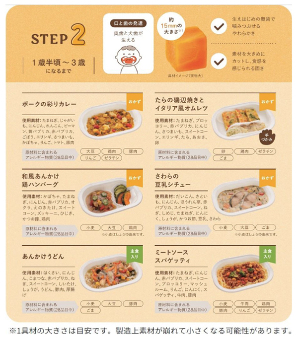 現在、1歳から1歳半頃までの「STEP1」メニューは全8種類、1歳半頃から3歳になるまでの「STEP2」メニューは全6種類を展開。今後もラインアップを順次拡大していく予定となっています。