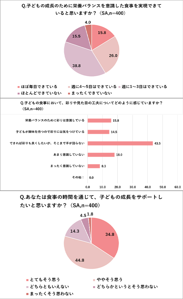 ブランド開発にあたっては、1〜3歳児を持つ共働き家庭で、子どもの食事作りに関与している男女各200名を対象に独自調査を実施。そんな「親子の食卓の実態調査」によると、子どもの食事で大切にしたい要素として「栄養バランス」の回答割合が74.5%と最も高い結果となりました。一方で子どもの成長のために栄養バランスを意識した食事を”ほぼ毎日”実現できている人は、わずか15.8%にとどまりました。