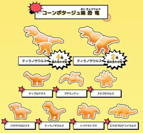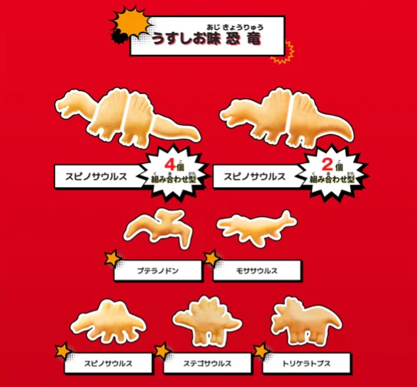 発売になるのは、おっとっと<うすしお味>限定4種、おっとっと<コーンポタージュ味>限定6種、うすしお味・コーンポタージュ味共通3種。計13種の恐竜の菓子型が楽しめるものです。