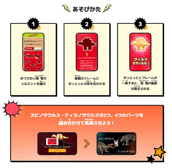 このブラウザコンテンツ「恐竜バトル!」は、恐竜のお菓子の形を探して、スマートフォンで特設サイト内の専用カメラから読み取ると、読み取った恐竜と、バトル相手の恐竜が画面上に現れ、迫力のあるバトル動画を楽しむことができるというもの。