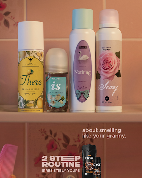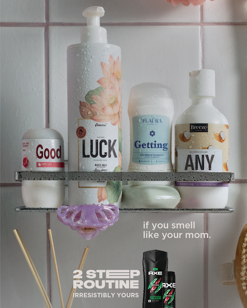 “A Scent That’s Irresistibly Yours(紛うことなきあなただけの香り)”というタイトルで公開されたのは、共通したメッセージングで企画された複数の雑誌広告。シャワールームに並ぶシャンプーボトルやボディーソープのボトルには「あなたが祖母と同じ香りをまとっても何もセクシーではありません」「お母さんと同じ香りをまとって意中の女性を射止めようとしているのですか?」「5歳児と同じ香りをまとっても恋愛対象として見られることはないでしょう」と書かれており、ボディーソープやシャンプーの香りにこだわりがない男性が“とりあえずそこらへんに置いてある適当なもの”を使ってしまうという行為に着目しているのです。