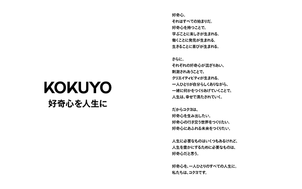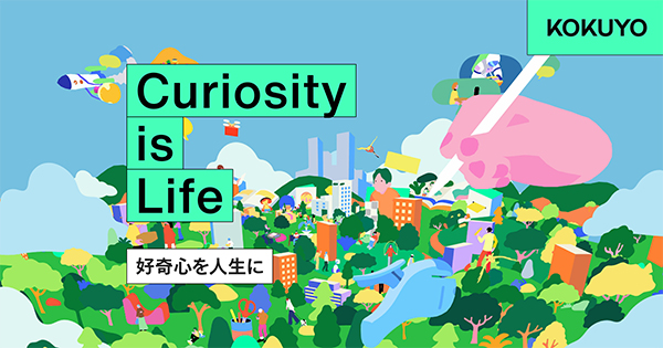 そして、コクヨ初のコーポレートメッセージを設定。⾃律協働社会の実現を⽬指すコクヨの新しいコーポレートメッセージとして「好奇⼼を⼈⽣に」を据えています。