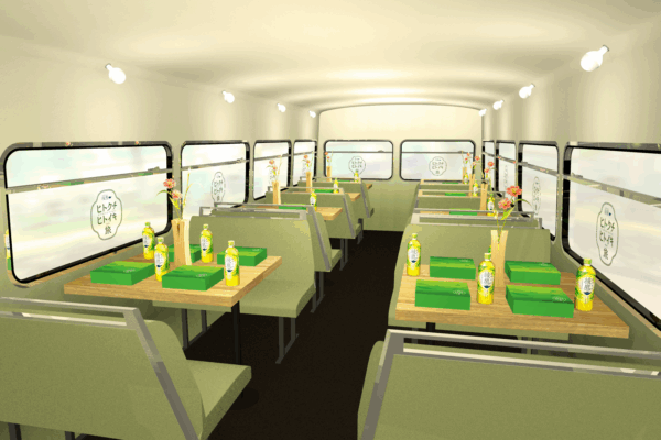 バスに和モダンを基調とした空間をしつらえ、和菓子作家・坂本紫穗さん監修による秋らしいオリジナル和菓子と綾鷹を味わいながら、ゆったりとした時間を楽しむというツアーです。