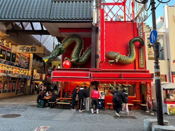 道頓堀の名物といえば、金龍ラーメンの立体看板。龍が建物を貫くように鎮座するその姿は、観光地・大阪の象徴とも言える存在です。ラーメンそのものはあっさりとしたとんこつ味で、卓上のキムチやニラで自由にカスタマイズできる“余白”が魅力。