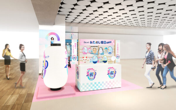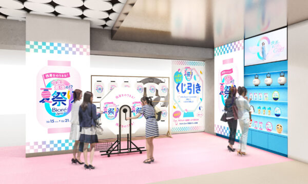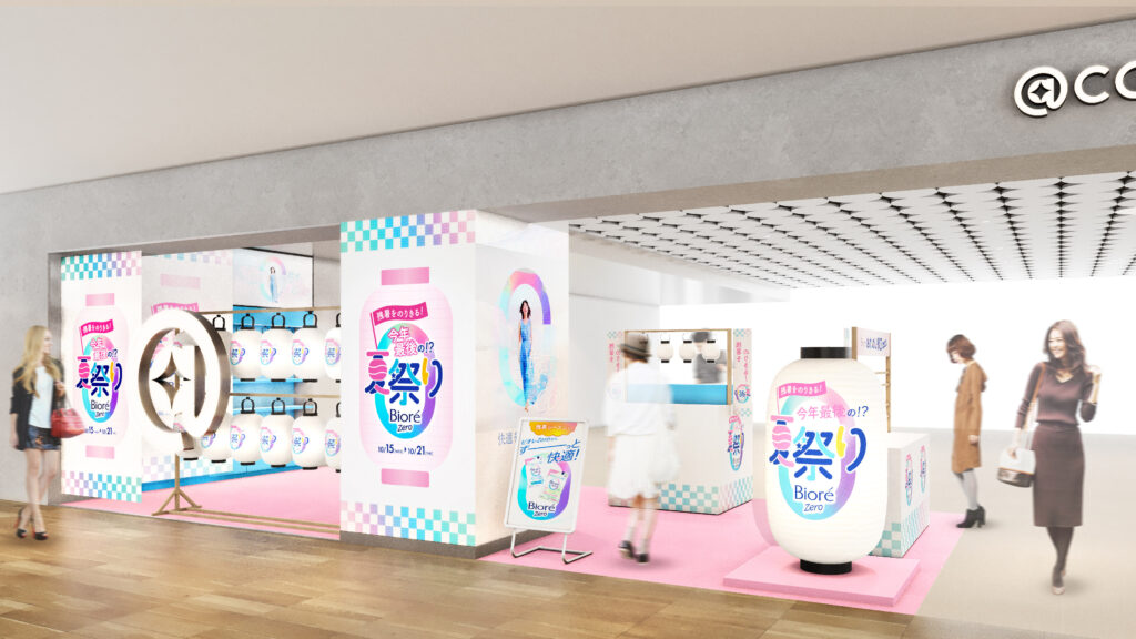 会場では、夏祭りの縁日をイメージした体験型コーナーを展開。「ビオレZero シート」「ビオレZero さらさらパウダーシート」「ビオレUV アクアリッチ ウォータリーホールドクリーム(水肌記憶UV)」など、残暑対策に適した商品がラインアップ。参加者を対象としたくじ引きや、対象商品購入者へのサンプル配布などが行われます。