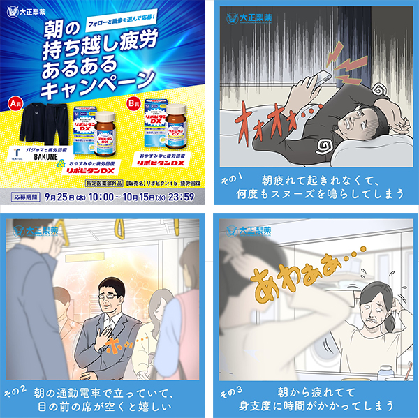 また、「朝の持ち越し疲労あるあるキャンペーン」でも、この“あるある”をイラストで表現されています。多くの人の共感を呼ぶ日常の疲労シーンを描くことで、リポビタンDXが提供する「朝の持ち越し疲労」の予防という価値を、より身近に感じさせることを目指しています。