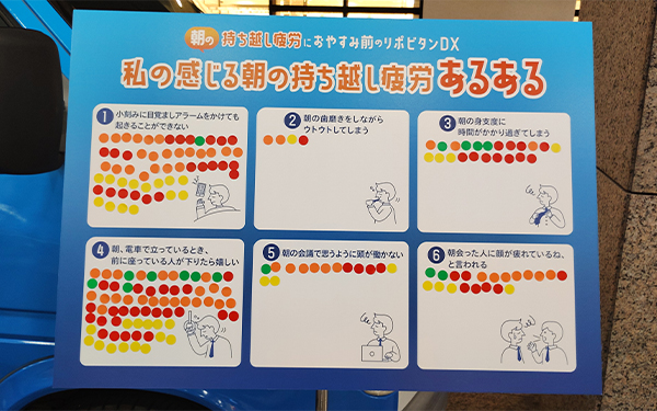 そんな「朝の持ち越し疲労」という言葉を広く知ってもらおうと、「リポビタンDXベッドカフェ」を2025年6月に都内で開催しました(PR EDGEの記事はこちら)。イベントでは、来場者から「朝の持ち越し疲労」にまつわる「あるある」を聴取。なかでもとくに多くの共感を得たのが「朝の通勤電車で立っていて、目の前の人が降りると嬉しい」というものだったのだとか。