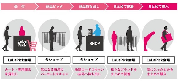 従来、ファッションアパレル店舗では、その店舗内で試着を繰り返す必要がありました。同社は、複数店舗で都度試着をすることで時間や手間がかかっていたことを課題ととらえ、このサービスを考案。LaLa Pickでは複数店舗の商品を1度に試して比較・検討することが可能になるといいます。