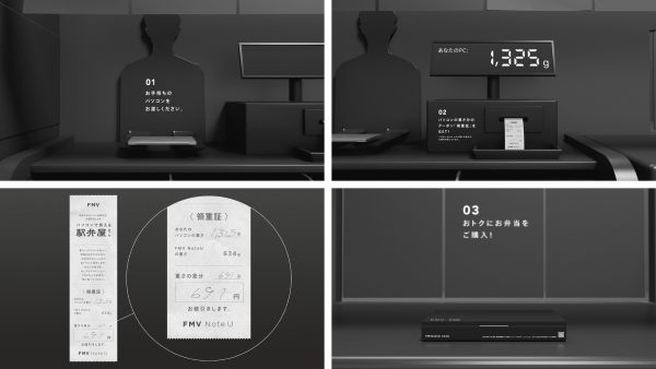 このお弁当屋さんの特徴は、持参したノートPCの重さに応じて割引が受けられること。FMV Note Uとの重量差が大きいほど割引額が増えるといい、割引クーポンとして“領重書”が発行されます。そのクーポンを利用すると最大700円までディスカウントした価格でお弁当を販売。つまり、重いパソコンを使っている人ほど“軽さの恩恵”を実感できる仕組みです。