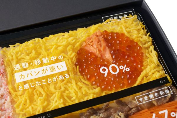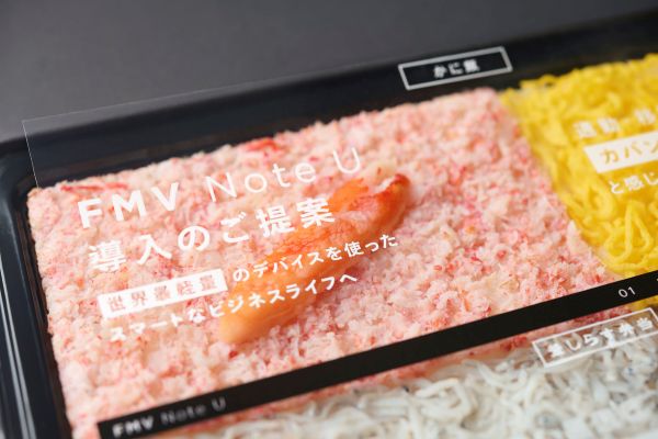 「FMVentoU」の中身は、FCCLが実施した「パソコンの重さに関する実態調査」の結果を食材でグラフ化したもの。おかずには福井のカニ、山形のすき焼きなど全国の名産品が詰め込まれました。そして、その表面は「FMV Note U導入のご提案」がプリントされたシートに覆われています。