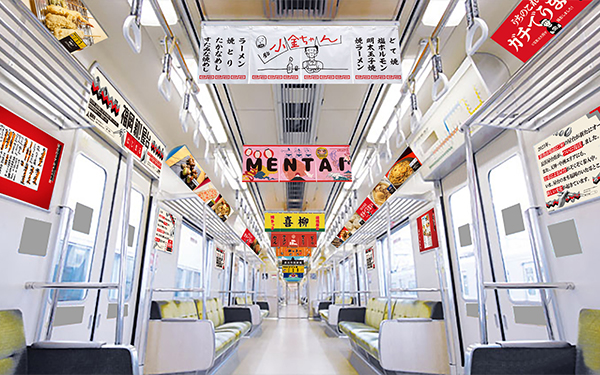 全6車両1編成すべての車内広告を貸し切り、屋台の“のれん”をイメージした中吊りや実際に屋台に置いているメニュー表を使った「屋台のリアルメニュー展」をドア横に掲出。窓上には、店主自身が料理の撮影をした「うちのこれはガチでうまい展」の装飾も施されました。