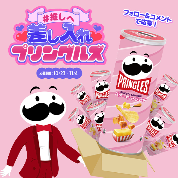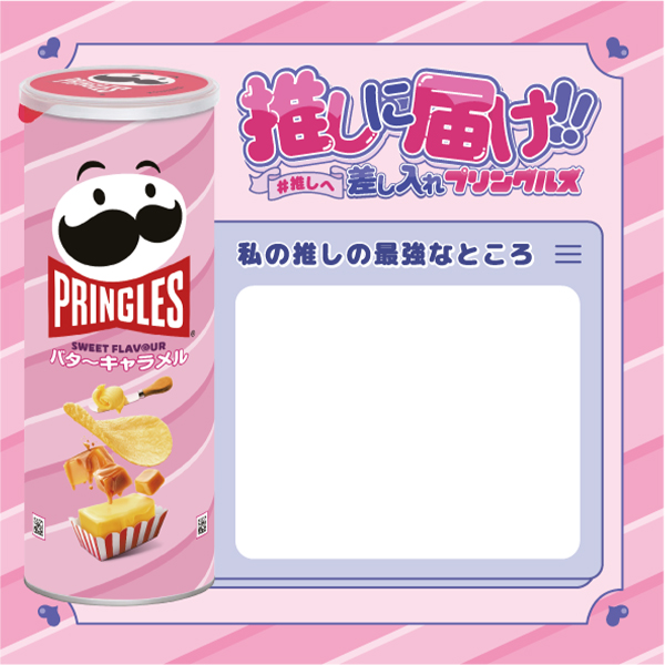 また、“推し”への応援をテーマにしたSNSキャンペーンをInstagramとTikTokで実施します。これは、推しの名前、指定のハッシュタグ「#推しへ差し入れプリングルズ」と一緒にメッセージを投稿することで、応援を投稿数としてカウント。投稿数の多かった上位10組の推しが所属する事務所へ、集まった応援メッセージとともに「プリングルズ バターキャラメル」を差し入れされるというものです。