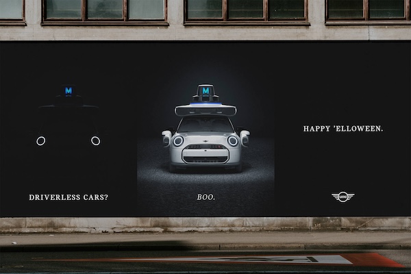 施策の核となるのは、自動運転技術を活用したタクシーサービスを展開するGoogle(Alphabet)傘下の企業・Waymoの“コスプレ”。車のルーフ部分に独特のアタッチメントが付けられたWaymo車を模したデコレーションが施されたMINIを街中で走らせることで、道行く人は「果たしてあれはWaymoなのか、MINIなのか?」という疑問と直面することに。ハロウィンだからこそ仮装というアイデアをフックにした、MINIらしさ全開の事例でした。