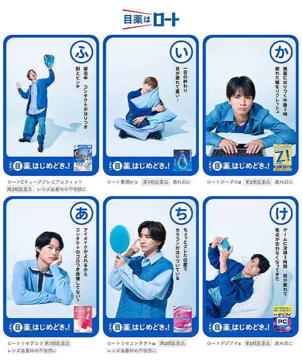 2023年の開始から3年目となる、今回の2025年キャンペーン。「画面にはりつく午後3時 疲れた瞳をリフレッシュ」「部活中 コンタクトがはりつき 割とピンチ」など、毎日の暮らしにひそむ目の不快感やトラブルを「目薬はじめどきっ! カルタ」として発信。カルタの言葉にあわせてSixTONESのメンバーがコミカルに演じる絵柄が印象的な仕上がりになっています。