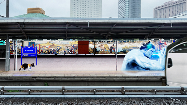 PS5のもたらす体験価値を表す大型広告ーー両国駅で巨大魔人力士が電車を止める!?