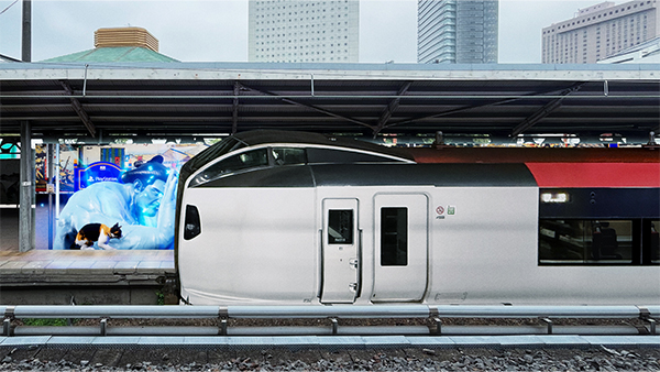 さらに、3番線ホームに電車が乗り入れる際に、レア演出を用意しました。平日17:35過ぎに1回だけ入線する電車に合わせて、2番線ホームから見ることができるというスペシャル演出です。そこでは、猫がディスプレイの端から駆け足で登場。入線してくる電車に驚いて逃げ出すと同時に、上から魔人力士が飛び降りてきます。魔人力士は迫ってくる電車に立ち向かい、押されながらも電車をギリギリで止め、猫のピンチを救うというものです。