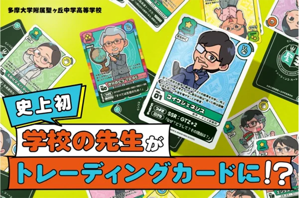 多摩大学附属聖ヶ丘中学高等学校(東京都多摩市)は、教員を学校の魅力そのものと捉え、「先生トレーディングカード」を制作しました。専任教員40名をプロのイラストレーターが描き下ろし、教師自身が考えた名前やフレーバーテキストを盛り込んだカードとして2025年配布しました。