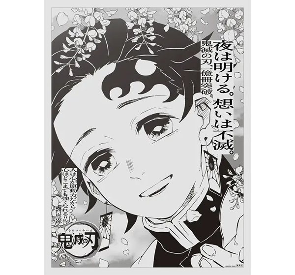 続けて、12月4日(金)の朝刊には産屋敷耀哉の想いを継いで、鬼との命懸けの戦いに挑んだ主人公・竈門炭治郎(かまどたんじろう)をはじめとするメインキャラクター15名のビジュアルとセリフ、そして、著者から読者へのメッセージを綴った「1億冊感謝記念広告」が掲載され、コンプリートするため全紙を購入するファンが多数現れるなど、話題になりました。