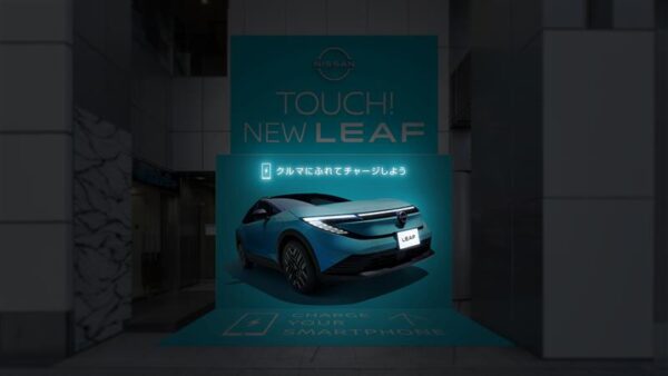 広告ビジュアルは新型リーフを大きく描いたシンプルな構成ですが、「TOUCH! NEW LEAF」「クルマにふれてチャージしよう」という言葉で通行者を誘導します。壁面内部には充電ユニットが仕込まれており、スマートフォンを近づけると給電がスタート。“触れる”ことで価値が伝わる広告です。