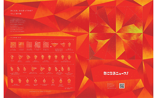 その一環として、2025年11月26日(水)付の信濃毎日新聞では、「りんご折り紙」が掲載されました。暖色の幾何学模様の紙面は鮮やかで、視覚的にも惹きつけられるインパクトのあるものです。また、キリトリ線に沿って切り、折り方イラストの手順に沿うと、立体的なりんごができ上がる仕掛けになっています。