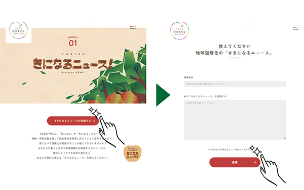 同じく11月26日(水)から地球温暖化にまつわる「きになるニュース」の募集も開始されました。普段の暮らしのなかで地球温暖化を実感するエピソードや、社会・環境の変化など、身近に感じる「きになるニュース」を公式サイトから投稿してもらおうというものです。1投稿につき、100円が植樹・育樹活動に取り組む団体に寄付され、ユーザーのアクションをもとに現実世界でも街に木が増えていく仕組みとなっています。