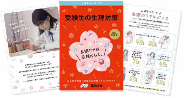 教学社の協力により制作された「受験生の生理対策」本は、受験前に知っておきたい基本的な生理ケアのヒントをコンパクトにまとめた冊子。2025年11月27日(木)から全国の一部書店で無料配布されるほか、特設サイトでは同内容のPDF版を公開し、スマホでも閲覧可能にしています。