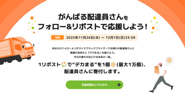 期間は2025年11月26日(水)の「いい風呂の日」から12月7日(日)まで。ブラックフライデーで配送荷物が増えるタイミングに合わせ、特大発泡入浴剤「温泡 デカまる」を全国の宅配ドライバーに最大1万個寄付します。