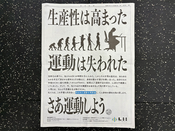 そんななかで、現代社会における運動不足の深刻化と、文明の進化とともに日常生活から運動が失われている現状に強い問題意識を持っているといいます。そこで、広くこの現状を知ってもらい、考えるきっかけにしてもらおうと「運動の再創造」をテーマとした新聞広告を掲載しました。掲載日は2025年11月26日(火)、毎日新聞(中部本社版)への掲載です。
