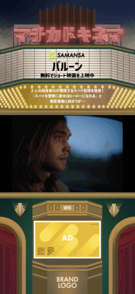 「マチカドキネマ」は、SAMANSAが世界各国から厳選したショート映画を上映し、オープニングおよびエンディングに動画広告を、映画上映中には画面下部に静止画広告を配信するサービスです。上映される映画は8〜10分ほどの短編で、アカデミー賞受賞作を含む多様な作品を扱います。