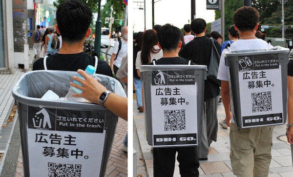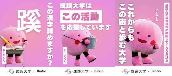 ごみ箱を背負い街ゆく人からごみを回収する歩く環境保全活動と、そのごみ箱を広告掲出場所として広告出稿を募る、環境保全とビジネスを両立させたサービス「BinGo」に、成蹊大学が広告出稿します。