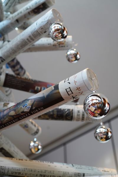 高さ約170cmのツリーは、ホテル開業(2018年)以降の新聞紙を素材に、紙を丸棒状に束ねて立ち上がるフォルムで構成。これは、かつて銀座の街で稼働していた輪転機のリズムや躍動を表現したものです。