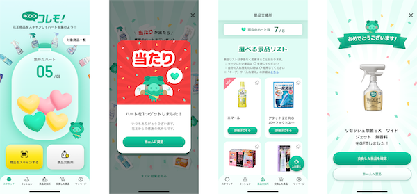 手持ちの花王商品のバーコードをスキャンすることで挑戦できるスクラッチくじや、アンケート回答、動画広告視聴などで、独自のポイント「ハート」が貯まるという仕組み。貯めたポイントは、アプリ内で提示される景品候補の中から好きな花王商品と交換できます。自宅への配送は、送料無料で3アイテムの交換が完了すると行われます。