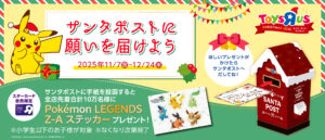また、2025年は、10月に登場した新作ゲームソフト『Pokémon LEGENDS Z-A』の発売を記念して、「ポケモンクリスマスキャンペーン in トイザらス」を開催。ポケモンオリジナルデザインで装飾された特設コーナーのほか、ポケモン商品を1回合計3,000円以上購入することで、ステッカーがもらえるプレゼントキャンペーンを展開し、子どもやファンの心を掴みます。