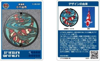 新潟県小千谷市では、立身出世の象徴「鯉(ニシキゴイ)」と、秋季に実施する花火大会「片貝まつり」をデザインしたマンホールをフィーチャーしたマンホールカードを配布します。