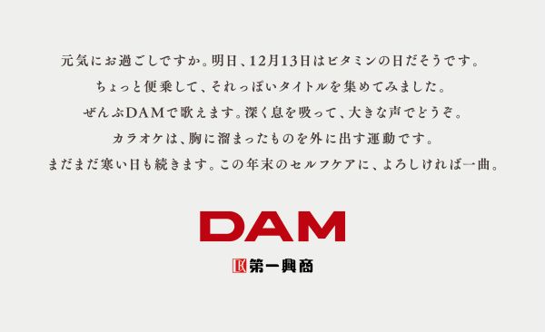 そんななか、第一興商・DAMが「声を出す」「音楽に浸る」時間をセルフケアとして提案する新聞広告とOOHを掲出します。ビタミンの日(12月13日)をフックに展開するモーメント事例にあたります。